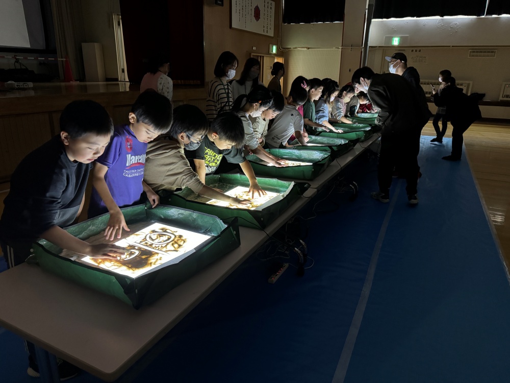 暗闇に浮かび上がる幻想的な砂の絵に感動し、その後の創作体験では夢中になって指を動かす。