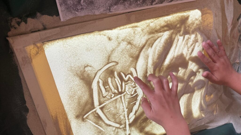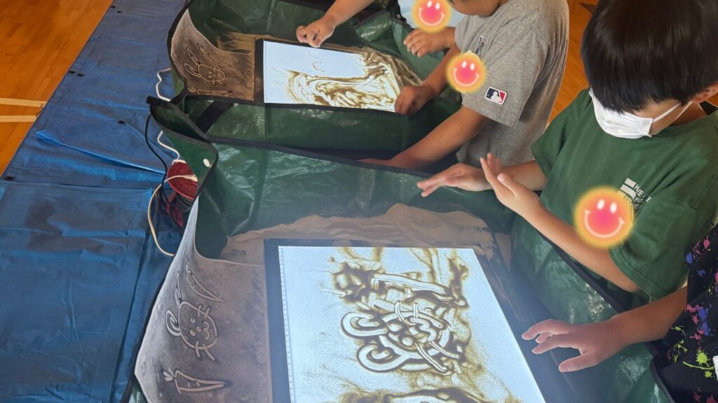 最初は「絵を描くのは苦手…」と少し不安そうな顔をしていた子も、指一本で砂を動かすだけで魔法のように絵が変化する様子に、あっという間に夢中になります。
